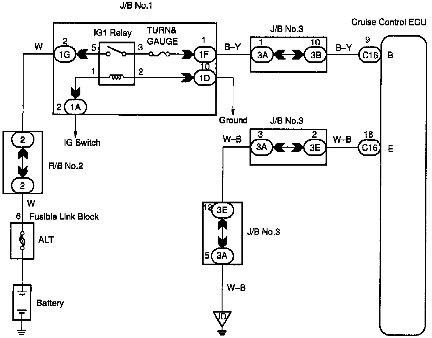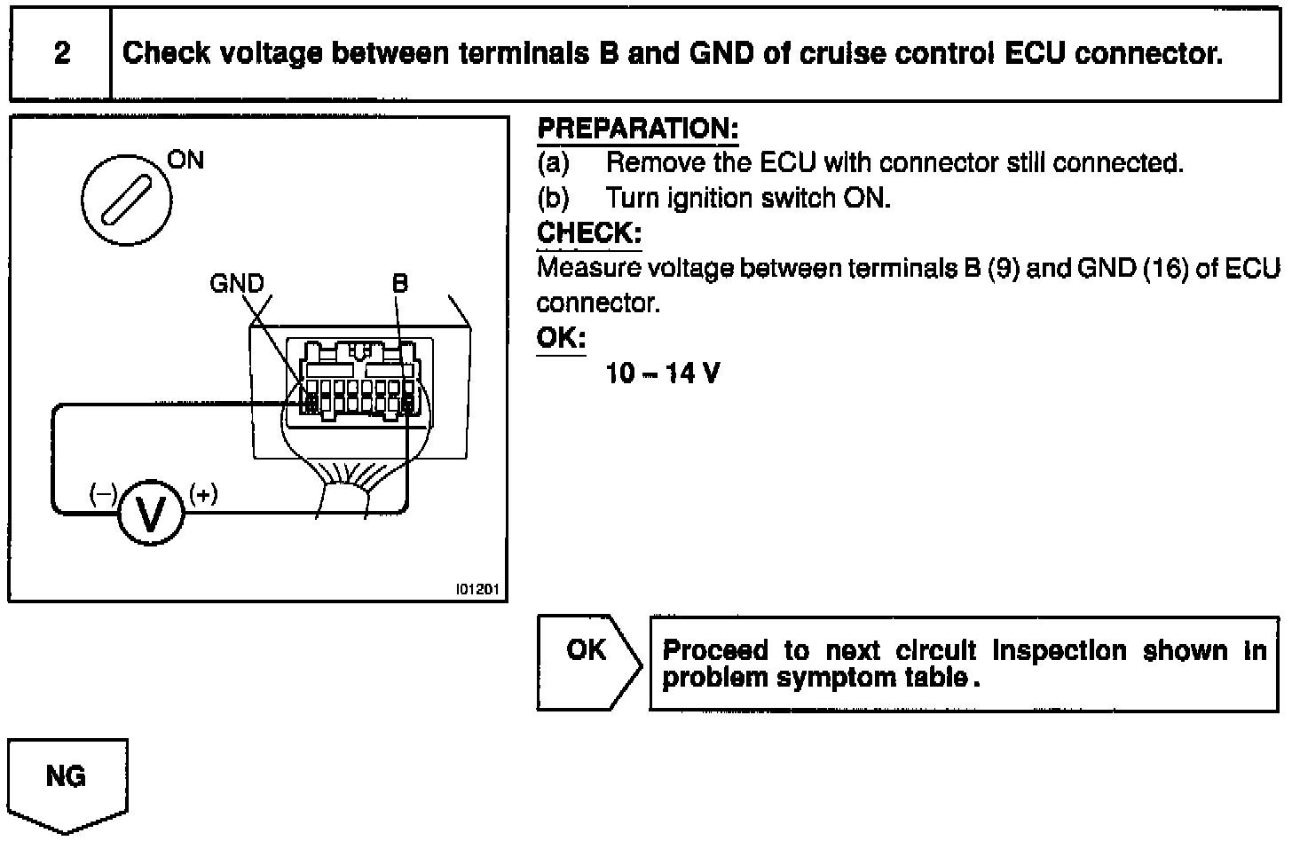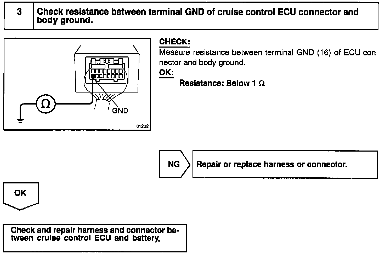 The ECU power source supplies power to the actuator and sensors, etc.. When terminal GND and the cruise control ECU case are grounded.