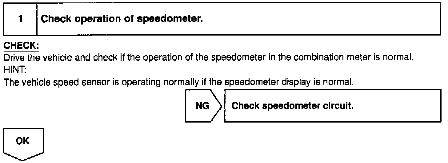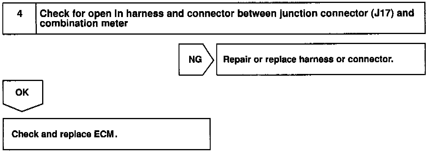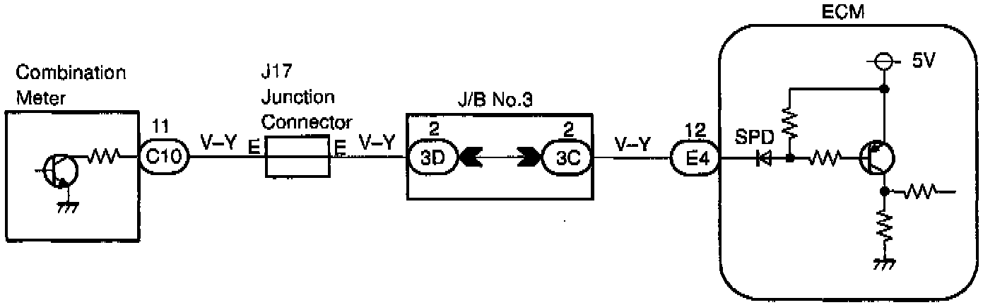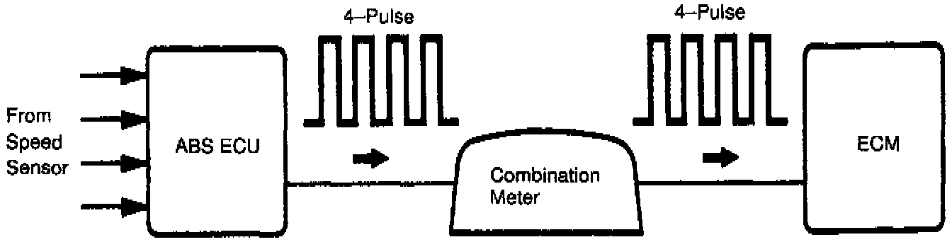 The speed sensor for ABS detects the wheel speed and sends the appropriate signals to the ABS ECU. The ECU converts these signals into a 4-pulse signal and outputs it to the combination meter. After this signal is converted into a more precise rectangular waveform by the waveform shaping circuit inside the combination meter, it is transmitted to the ECM. The ECM determines the vehicle speed based on the frequency of these pulse signals.