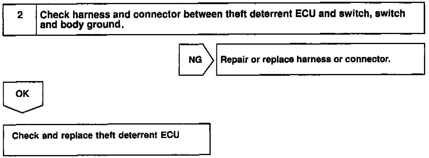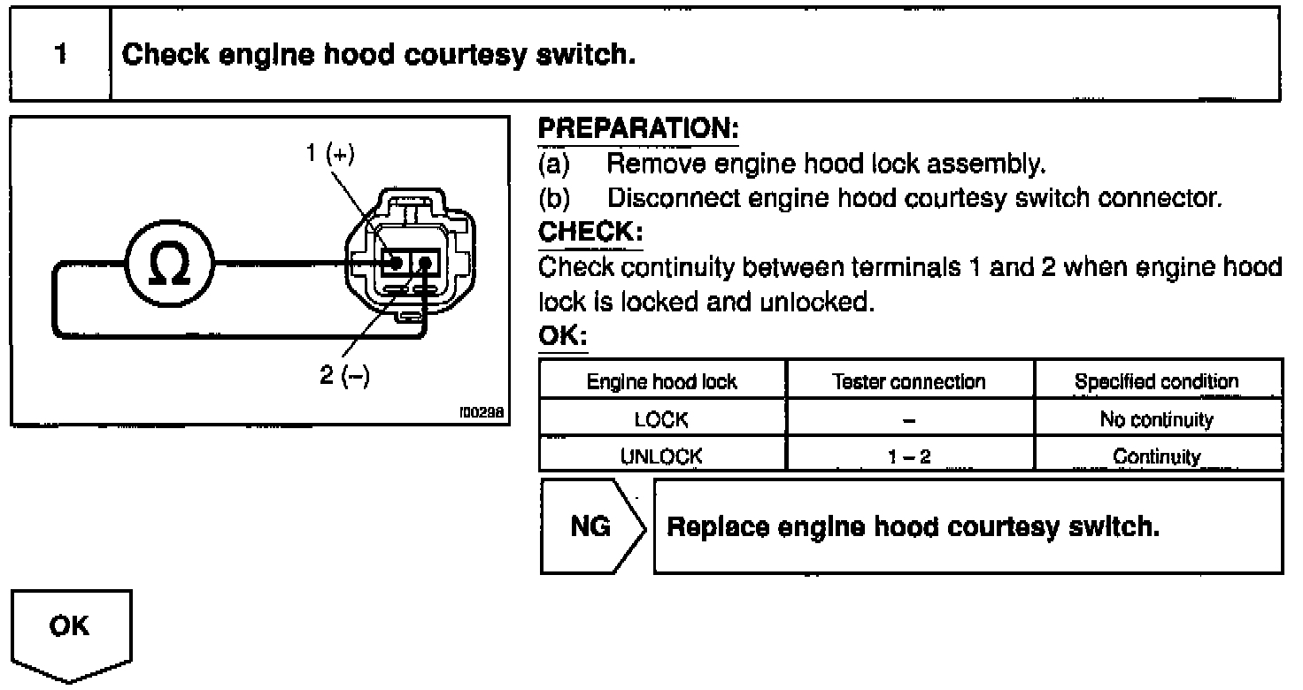 The engine hood courtesy switch is built into the engine hood lock assembly and goes ON when the engine hood is opened and goes OFF when the engine hood is closed.