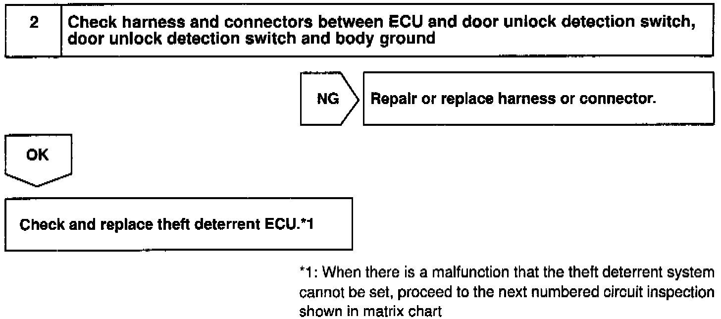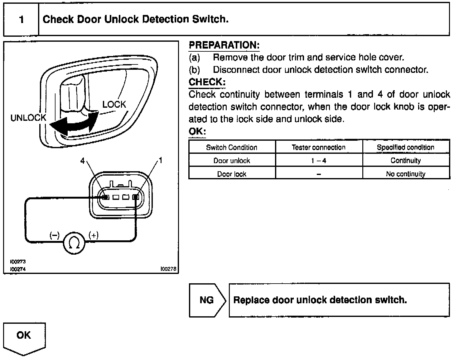 The door unlock detection switch is built in the door lock motor assembly. This switch is ON when the door lock knob is in the unlock position and OFF when the lock knob is in the lock position. The ECU detects the door lock knob conditions in this circuit. It is used as one of the operating conditions for the key confinement prevention function.