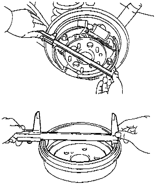 b. Measure the brake drum inside diameter and diameter of the brake shoes. Check that the difference between the diameters is the correct shoe clearance.