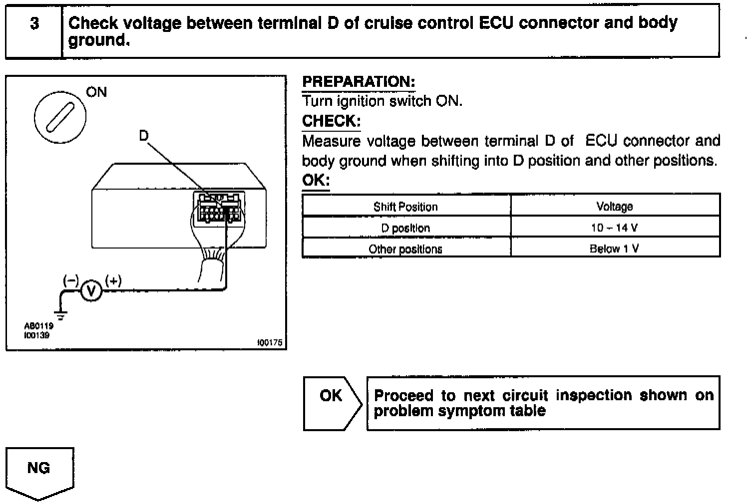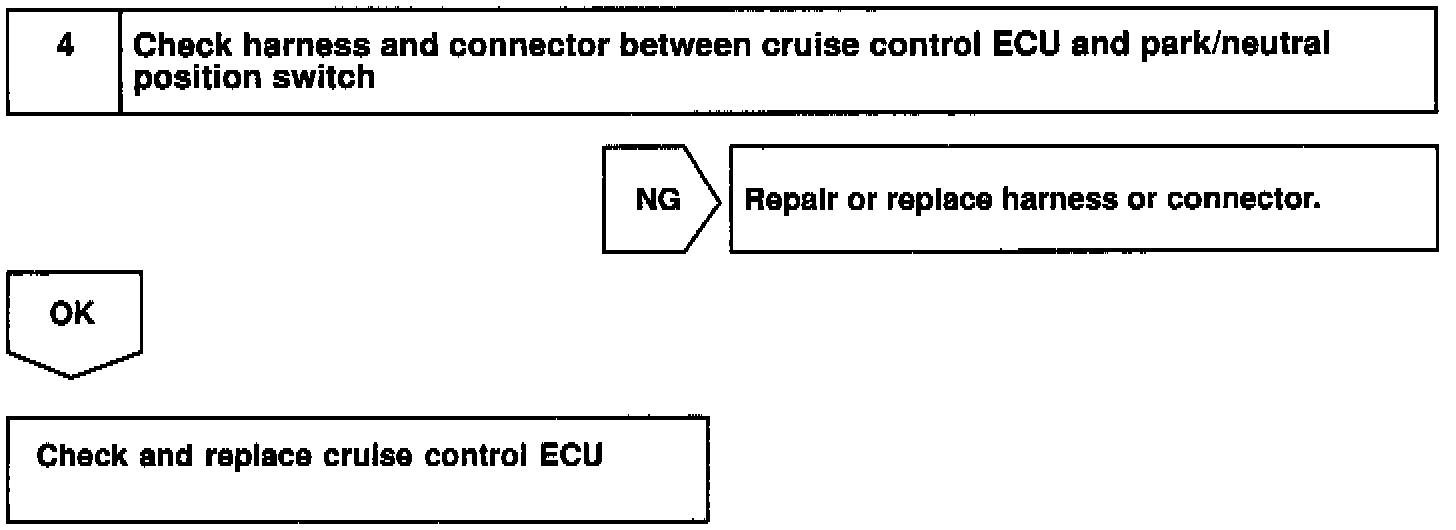 When the shift position is put in except D position, a signal is sent from the park/neutral position switch to the ECU. When this signal is input during cruise control driving, the ECU cancels the cruise control.