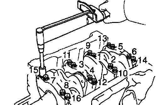 b. Install and uniformly tighten the 16 main bearing cap bolts in several passes, in the sequence shown.