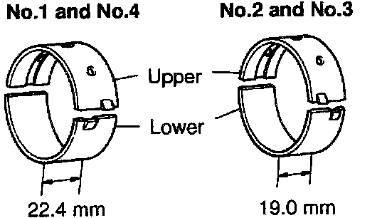 ^ Main bearings come in widths of 19.0 mm (0.748 inch) and 22.4 mm (0.882 inch). Install the 22.4 mm (0.882 inch) bearings in the No.1 and No.4 cylinder block journal positions with the main bearing cap. Install the 19.0 mm (0.748 inch) bearings in the No.2 and No.3 positions.