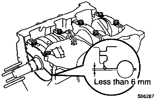 e. Insert the main bearing cap with your hand until the clearance between the main bearing cap and the cylinder block will become less than 6 mm (0.23 inch) by making the 2 internal main bearing cap bolts as a guide.