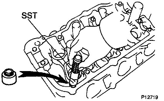 c. Using SST, compress the valve spring and place the 2 keepers around the valve stem.