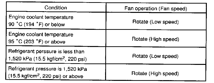 1. INSPECT CONDENSER FAN OPERATIONInspect the fan operation in these conditions, as shown in the chart.