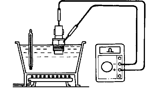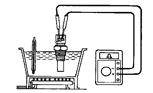 b. Using an ohmmeter, check that continuity exists between the terminals when the coolant temperature is below 90 °C (194 °F).
