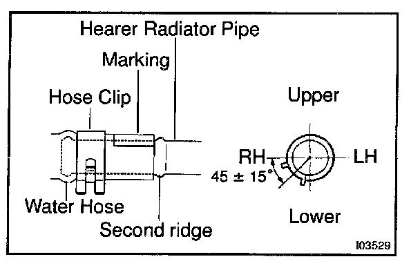 ^ Push the water hose onto the heater radiator pipe as far as second ridge on the pipe.