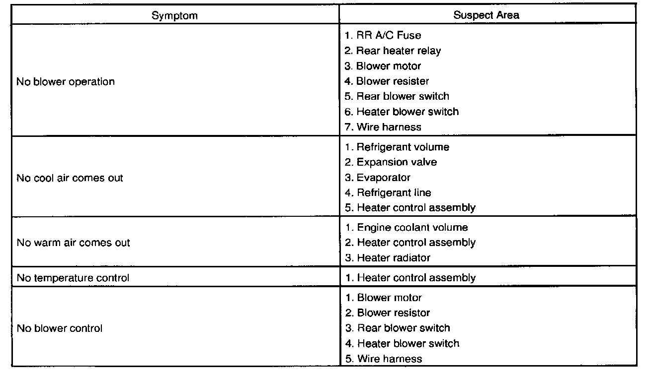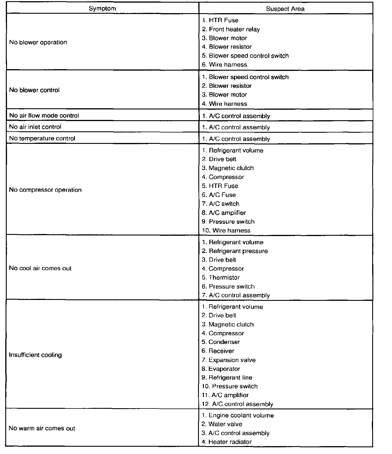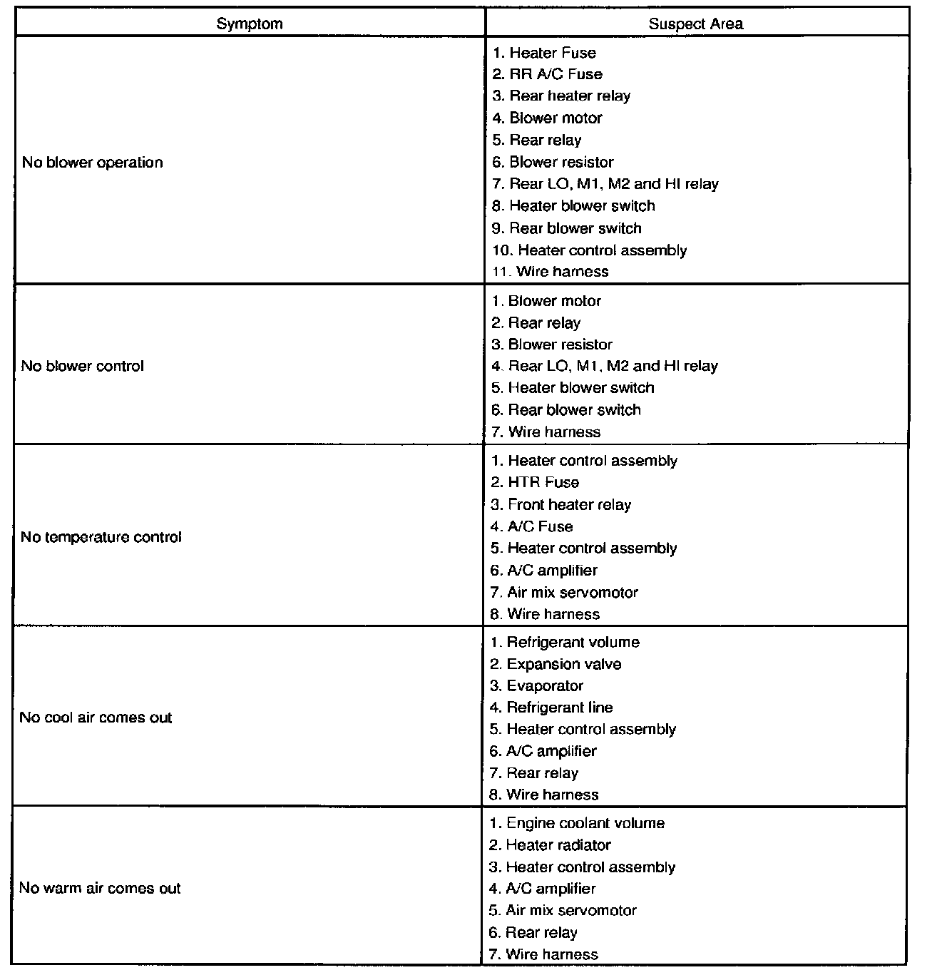 Use the table below to help you find the cause of the problem. The numbers indicate the priority of the likely cause of the problem. Check each part in order. If necessary replace these parts.Front A/C: