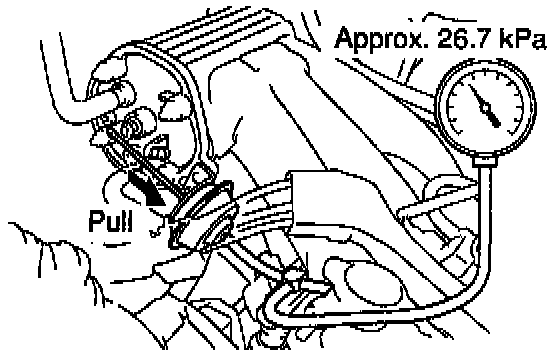(d) Rapidly depress the accelerator pedal to fully open position and check that the vacuum gauge needle momentarily fluctuates up to approx. 26.7 kPa (200 mmHg, 7.9 in.Hg). (The actuator rod is pulled out.)