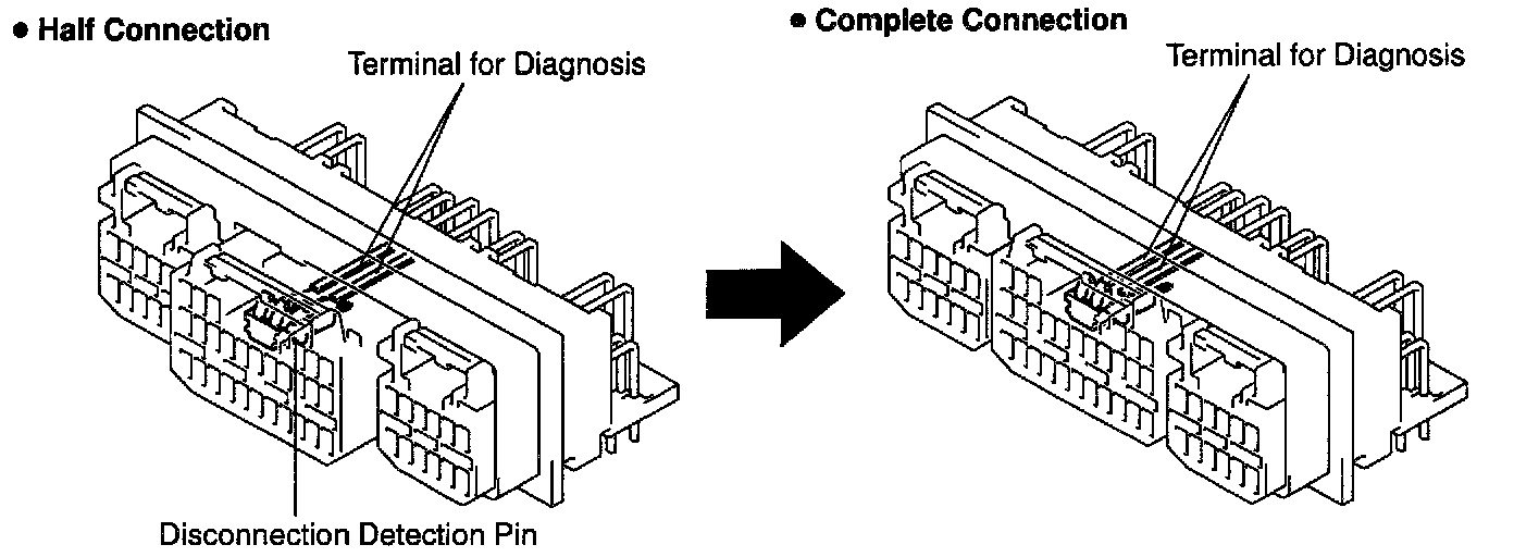 This mechanism electrically checks that connectors are connected correctly and completely. The electrical connection check mechanism is designed so that the disconnection detection pin connects with the diagnosis terminals when the connector housing lock is locked.