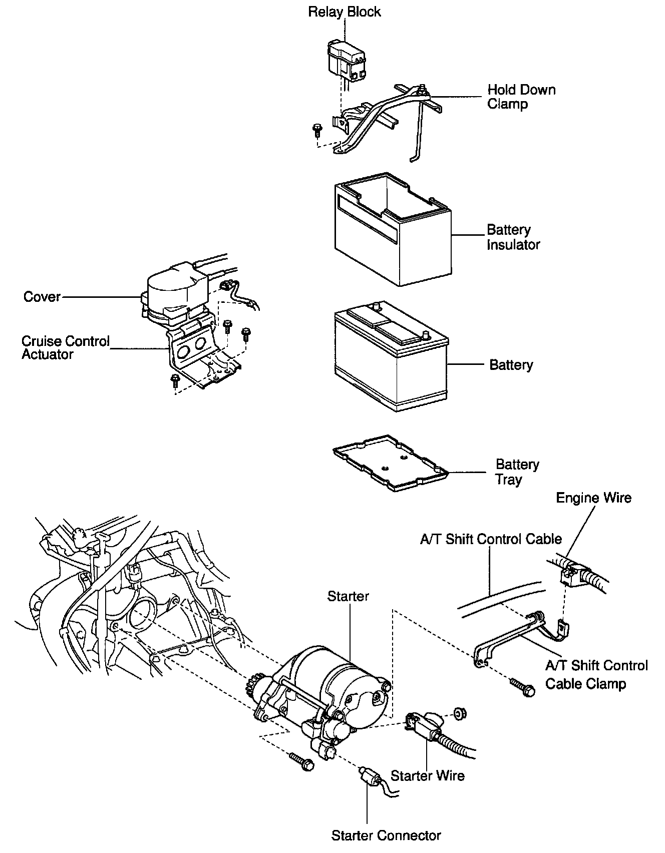 e. Remove the 2 bolts, A/T shift control cable clamp and starter.