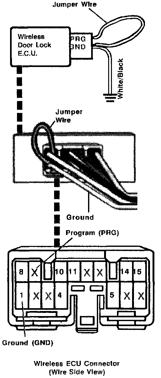 The PRG (Program) pin of the Wireless Door Lock ECU is grounded to perform programming. This is accomplished by accessing the Wireless Door Lock ECU directly, as there is NO PRG wire connecting to a satellite location.