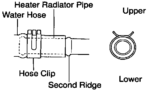 ^ Push the water hose onto the heater radiator pipe as far as second ridge on the pipe.