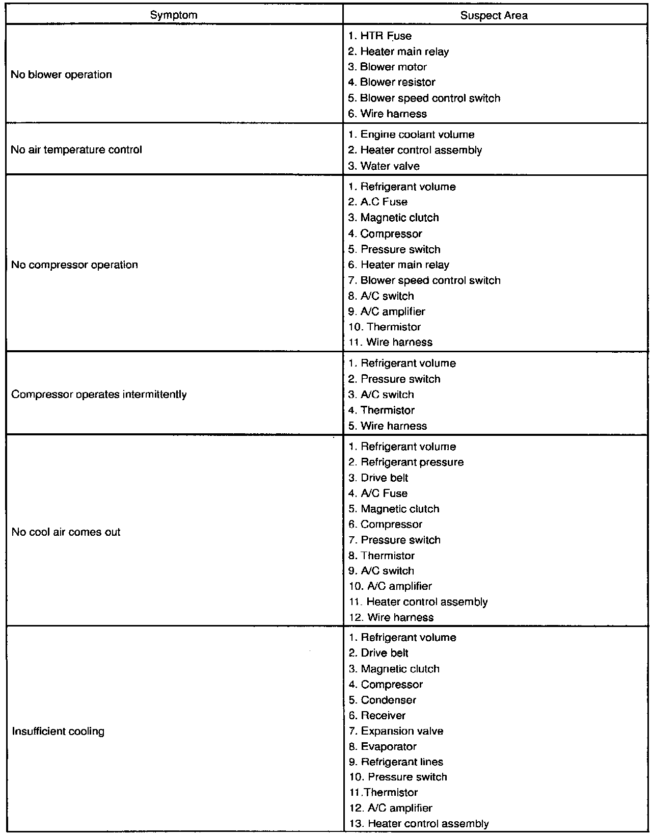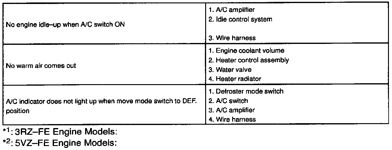 Use the table to help you find the cause of the problem. The numbers indicate the priority of the likely cause of the problem. Check each part in order. If necessary replace these parts.