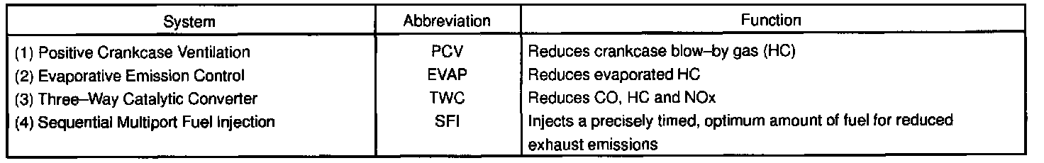 The emission control systems are installed to reduce the amount of CO, HC and NOx exhausted from the engine ((3) and (4)), to prevent the atmospheric release of blow-by gas containing HC (1) and evaporated fuel containing HC being released from the fuel tank (2).