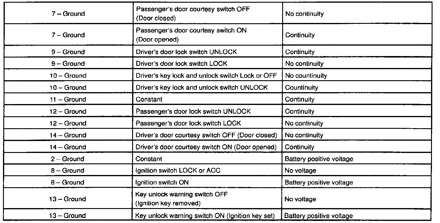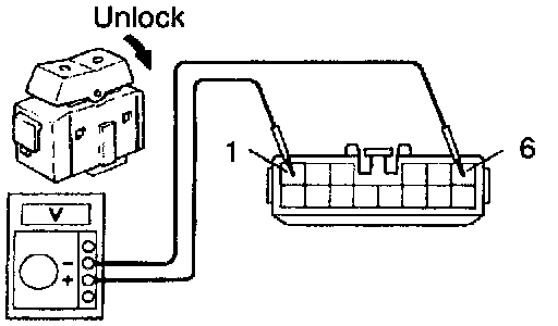 c. Set the door lock control switch to UNLOCK, check that the voltage rises from 0 V to battery positive voltage for approximately 0.2 seconds.