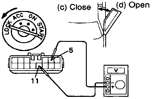 c. Close the door with ignition switch turned to LOCK or ACC, check that the meter needle indicates battery positive voltage.