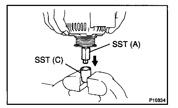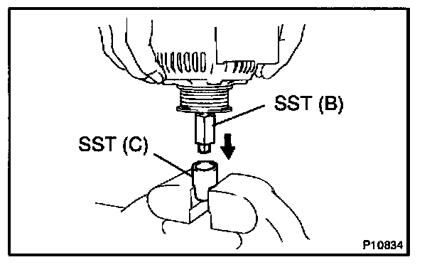 e. Insert SST (B) into SST (C), and attach the pulley nut to SST (C).
