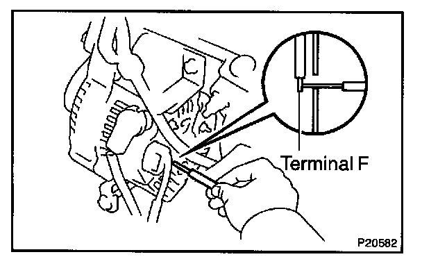 ^ With terminal F grounded, start the engine and check the voltage reading of terminal B.
