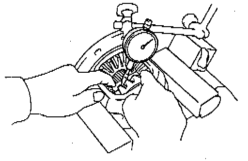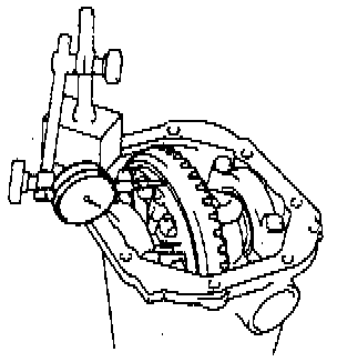 c. Using a dial indicator, measure the side gear backlash with holding one pinion gear toward the differential case.