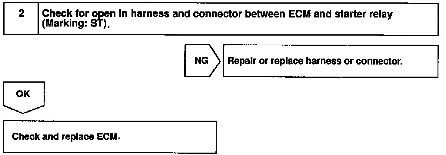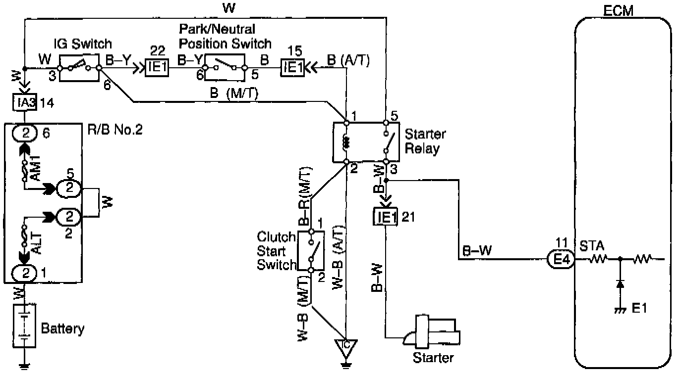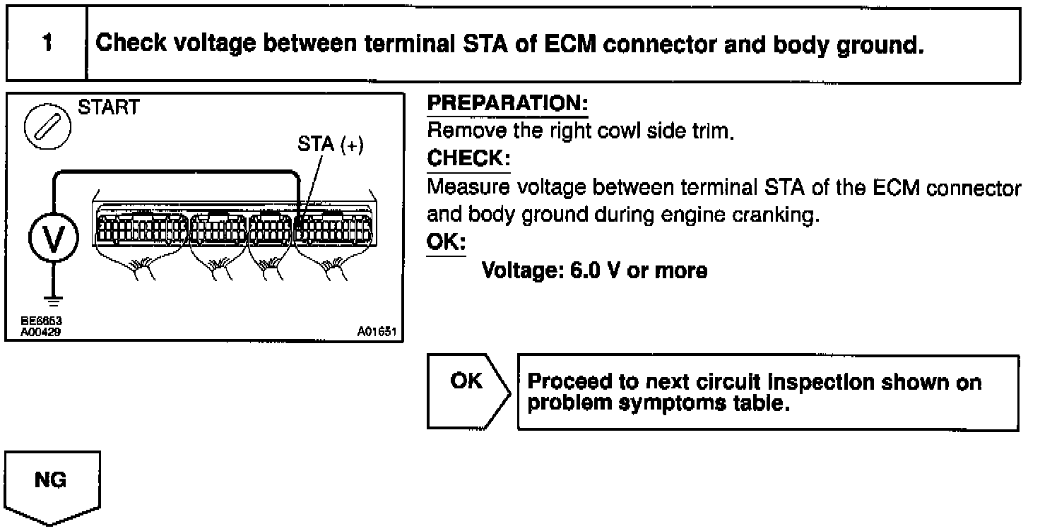 When the engine is cranked, the intake air flow is slow, so fuel vaporization is poor. A rich mixture is therefore necessary in order to achieve good startability. While the engine is being cranked, the battery positive voltage is applied to terminal STA of the ECM. The starter signal id mainly used to increase the fuel injection volume for the starting injection control and after-start injection control.