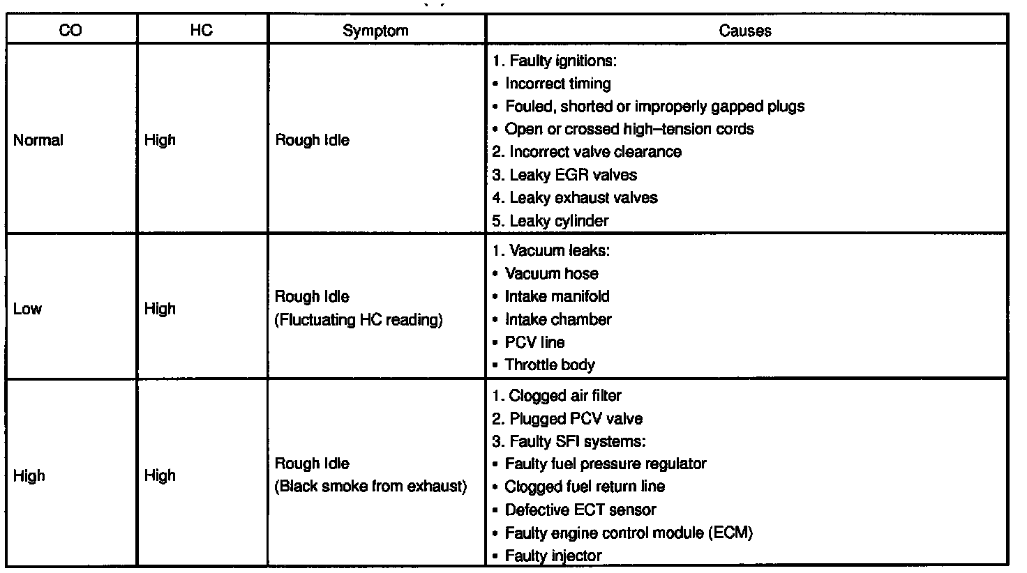 If the CO/HC concentration does not comply with regulations, troubleshoot according to the table.