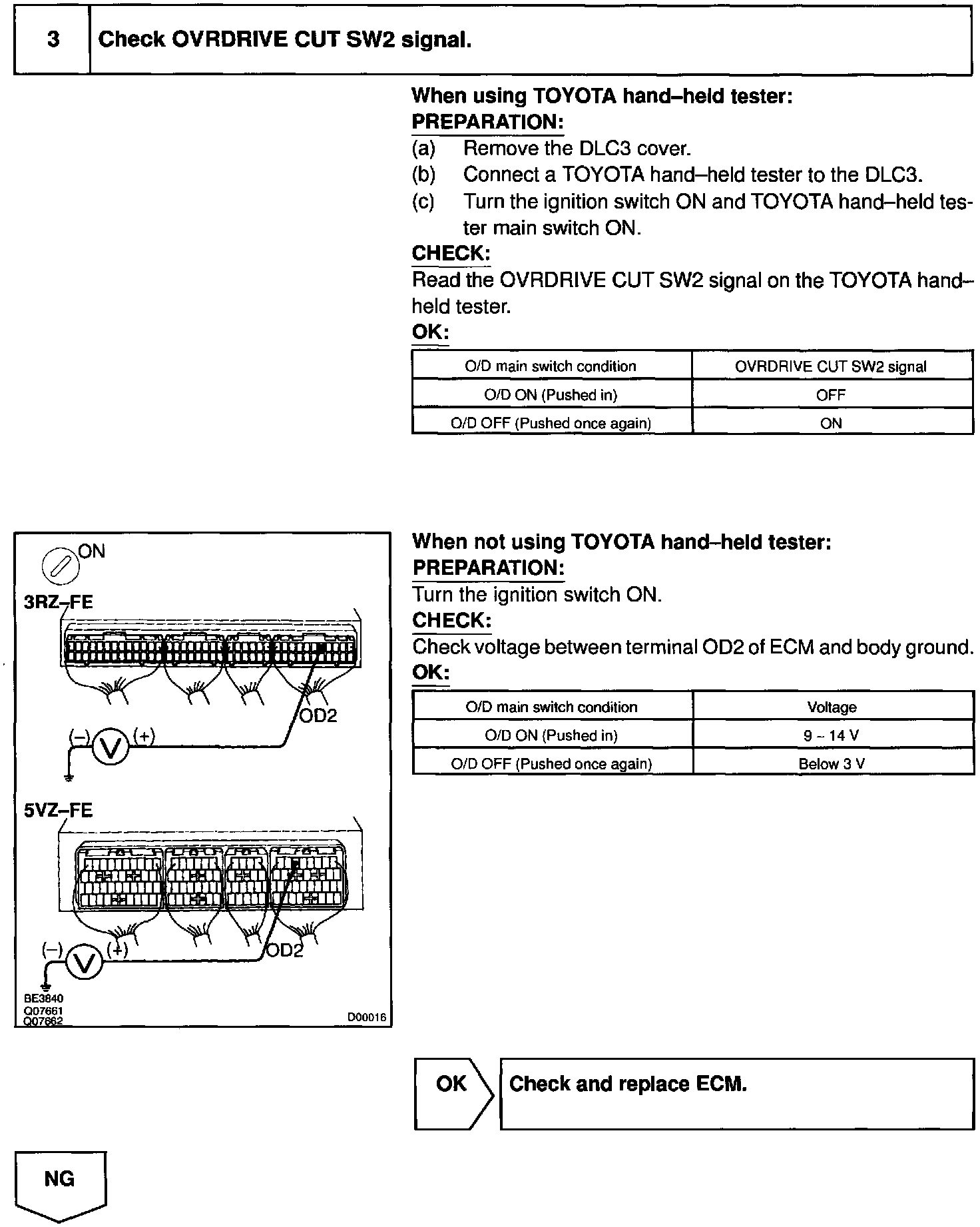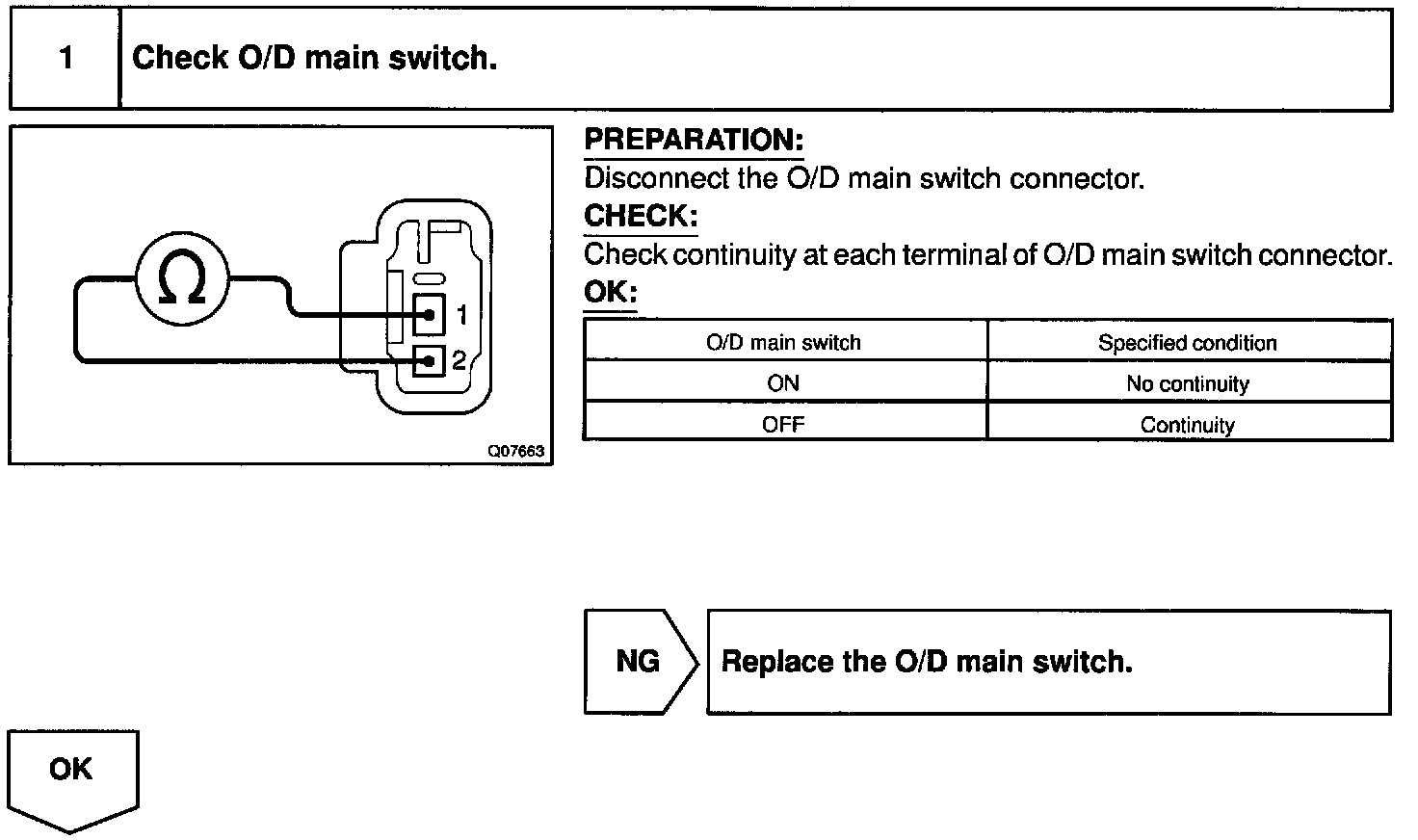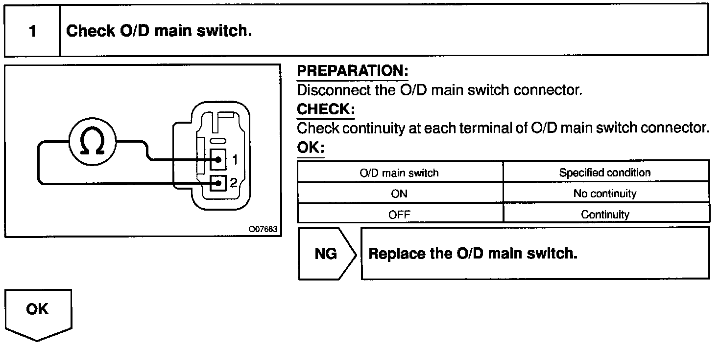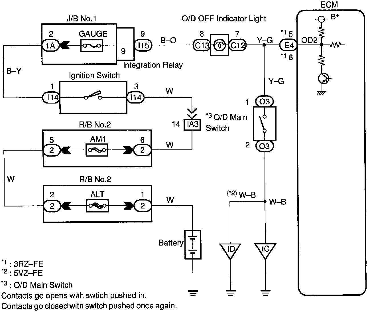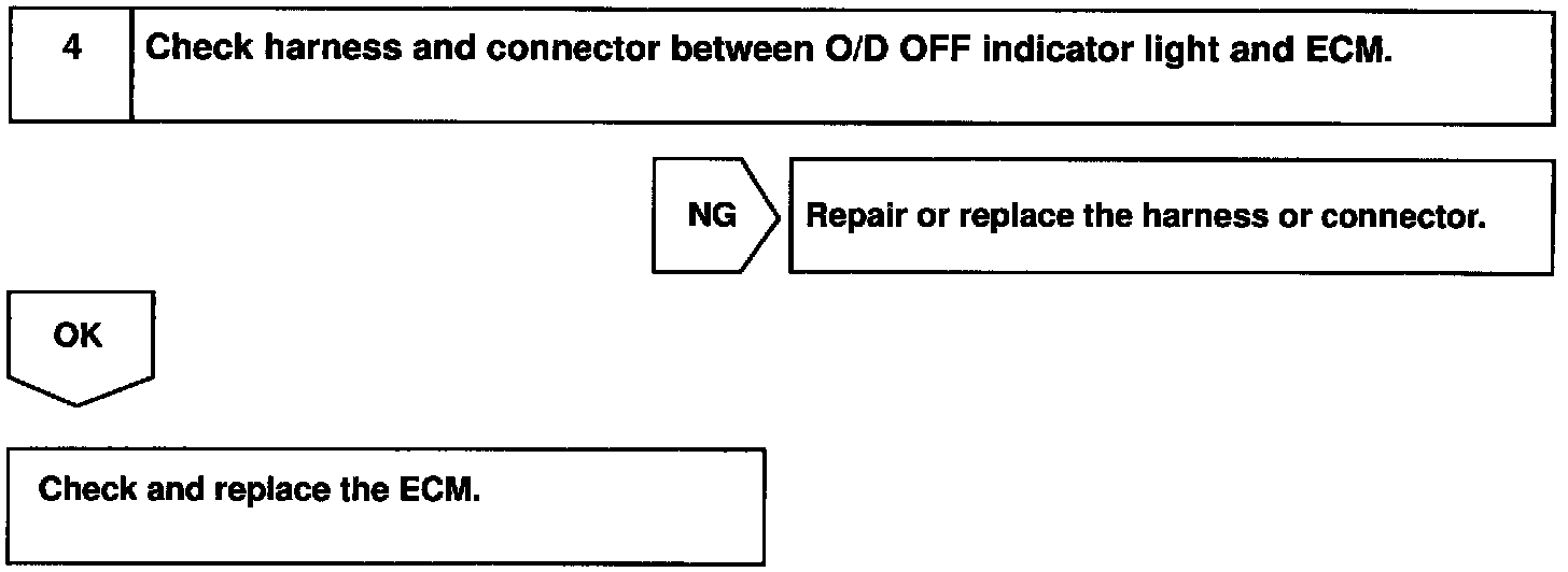 The O/D main switch contacts go open when the switch is pushed in and go closed when it is pushed out. In O/D main switch at OFF position, the O/D OFF indicator light lights up, and the ECM prohibits shifting O/D.