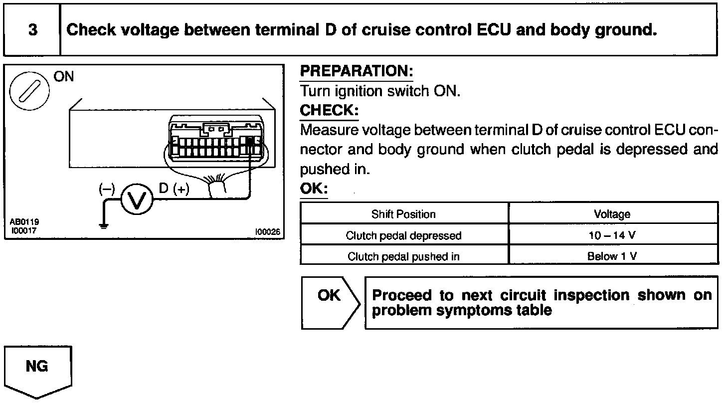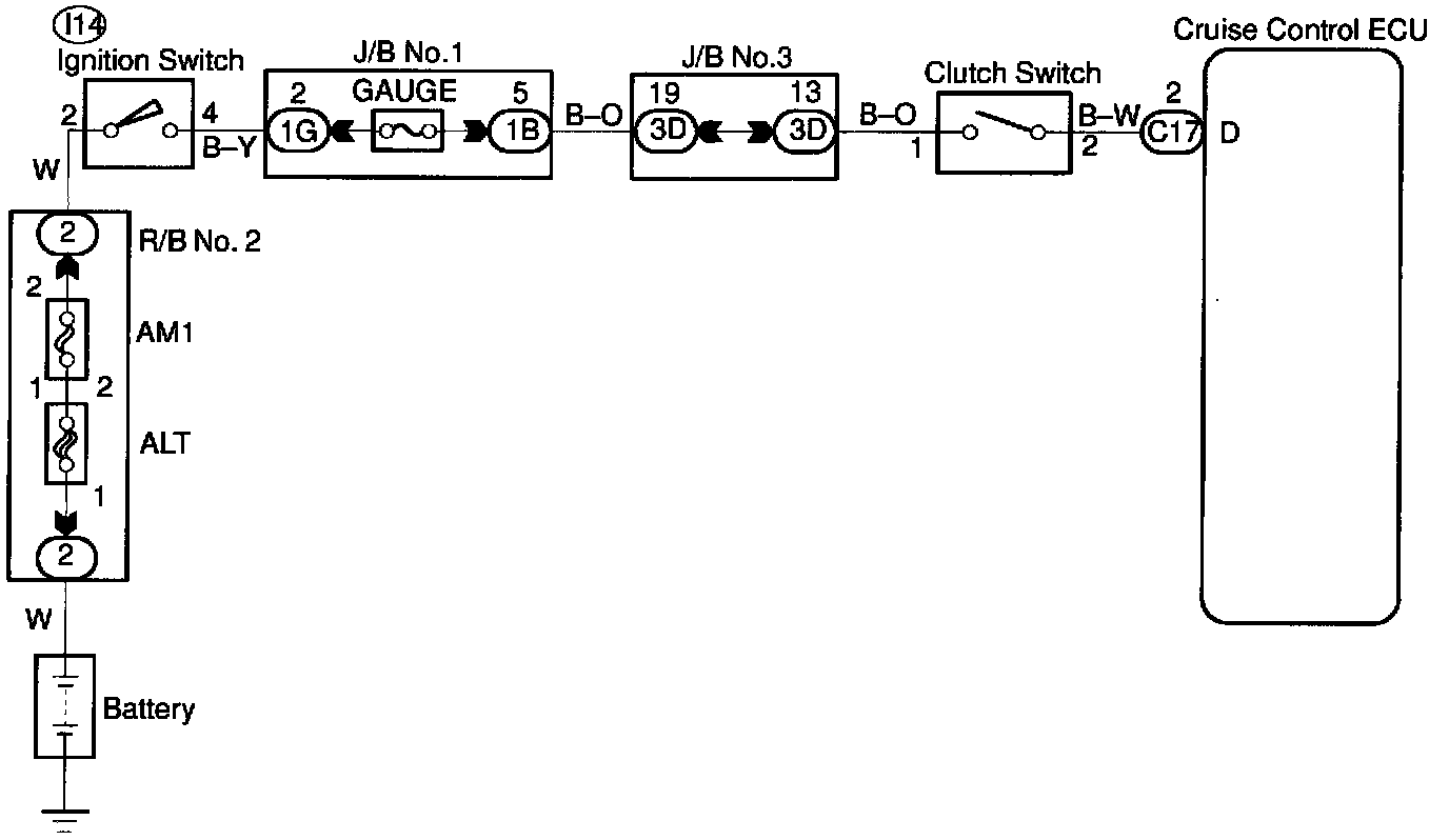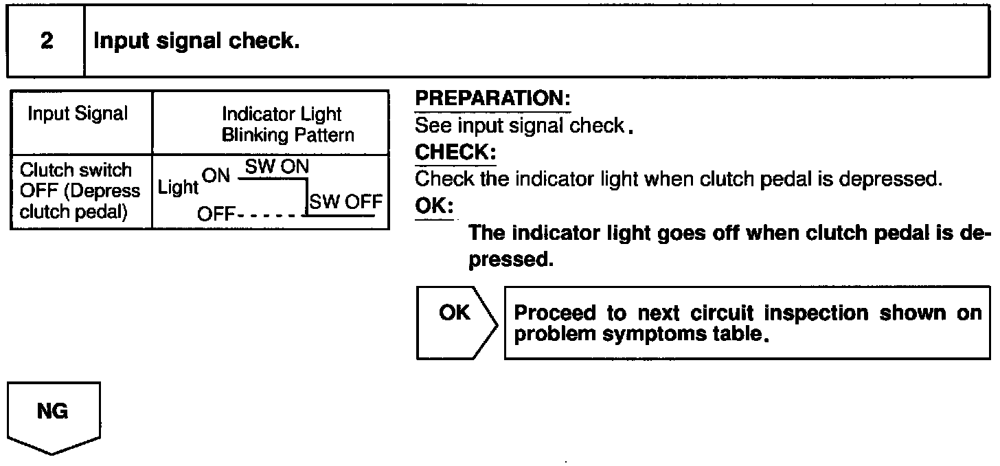 When the clutch pedal is depressed, the clutch switch sends a signal to the cruise control ECU. When the signal is input to the cruise control ECU during cruise control driving the cruise control ECU cancels cruise control.