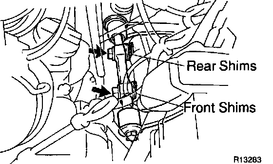 NOTICE: Adjust the shim thickness to 7 mm (+4, -3), and adjust the difference between the front and rear of the upper suspension arm shaft to within 4 mm.