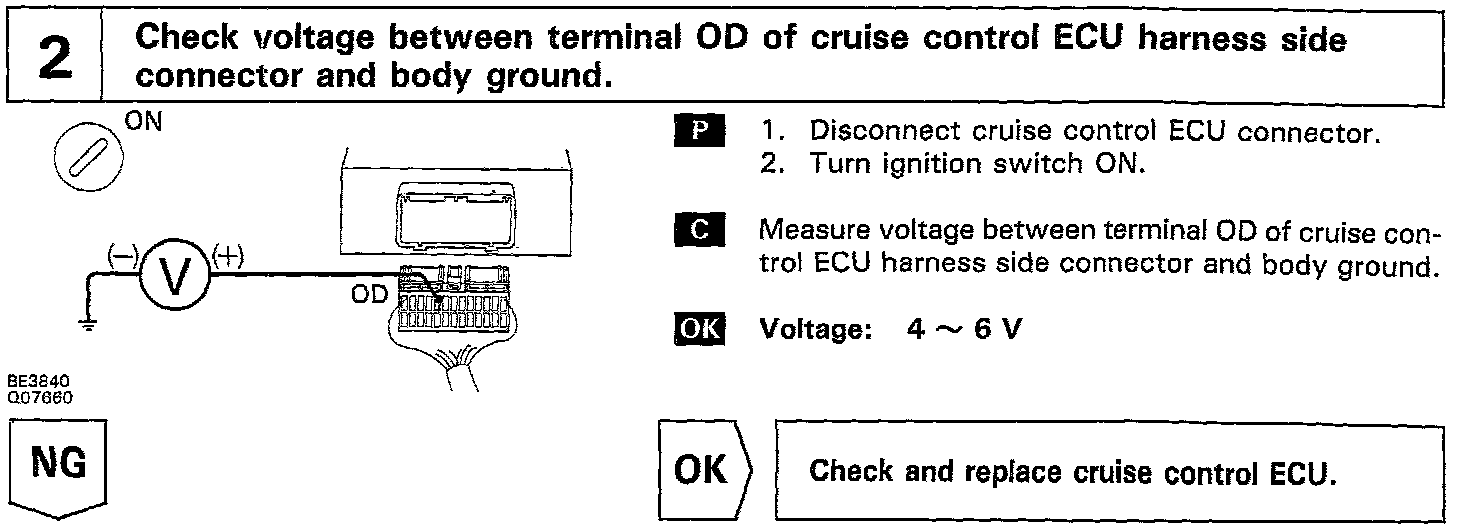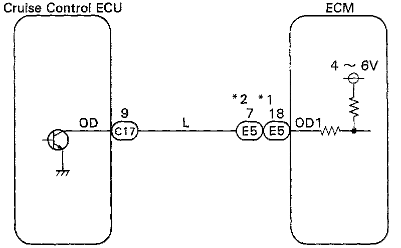The cruise control ECU sends O/D cut signals to the ECM as necessary and the ECM cancels O/D shifting until these signals are discontinued.