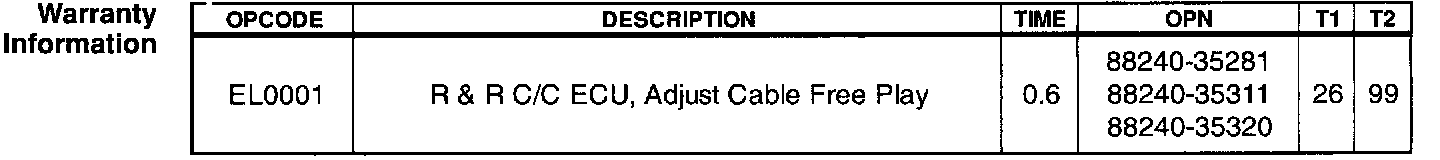 A revised cruise control ECU is available for 1998-1999 Tacoma trucks with automatic transmissions. While cruise control is engaged, the new ECU improves the upshift delay from 3rd to 4th gear after the vehicle comes over the crest of a hill. To correct the concern, replace the cruise control ECU and perform the cable adjustment procedure as shown in this bulletin.