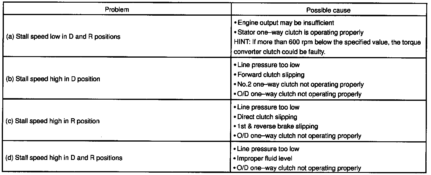 The object of this test is to check the overall performance of the transmission and engine by measuring the stall speeds in the D and R positions.