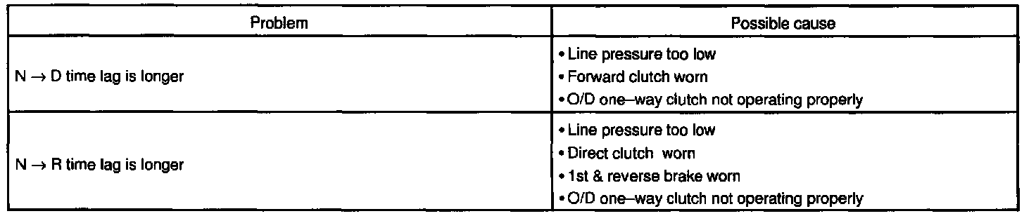 When the shift lever is shifted while the engine is idling, there will be a certain time lapse or lag before the shock can be felt. This is used for checking the condition of the O/D direct clutch, forward clutch and 1st & reverse brake.