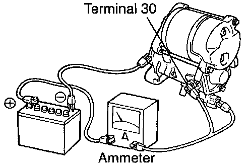 b. Check that the starter rotates smoothly and steadily with the pinion gear moving out. Check that the ammeter reads the specified current.