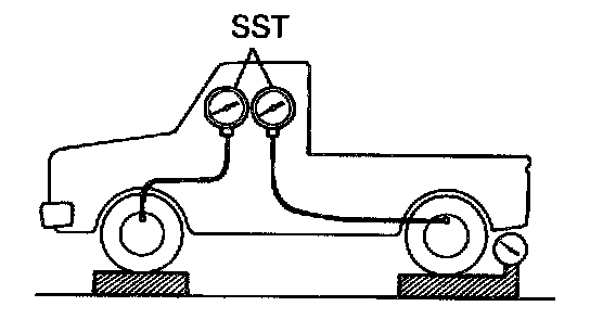 2. Install Load Sensing Proportioning & By-Pass Valve (LSP & BV) gauge Special Service Tool (SST) 09709-29018 or equivalent and bleed air.