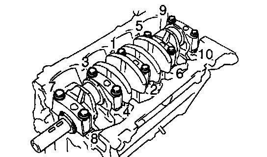 b. Install and uniformly tighten the 10 bolts of the main bearing caps, in several passes, in the sequence shown.
