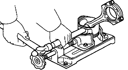 c. Using plastic-faced hammer and brass bar, lightly tap out the piston pin and remove the connecting rod.