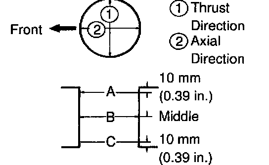 Using a cylinder gauge, measure the cylinder bore diameter at positions A, B and C in the thrust and axial directions.