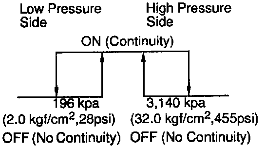 b. Check continuity between terminals when refrigerant pressure is changed, as shown in the illustration.