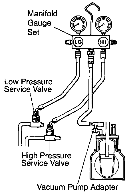 b. Connect the center hose of the manifold gauge set to the vacuum pump adapter.
