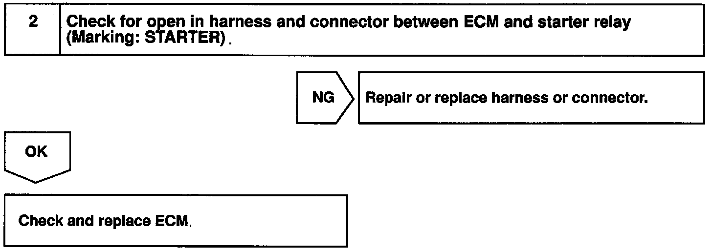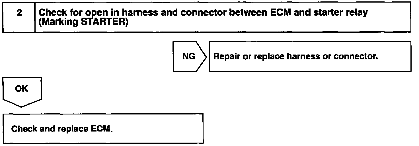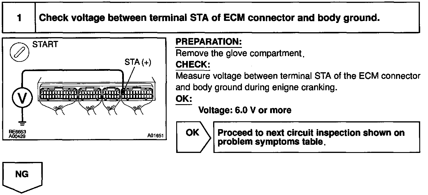 When the engine is cranked, the intake air flow is slow, so fuel vaporization is poor. A rich mixture is therefore necessary in order to achieve good startability. While the engine is being cranked, the battery positive voltage is applied to terminal STA of the ECM. The starter signal id mainly used to increase the fuel injection volume for the starting injection control and after-start injection control.