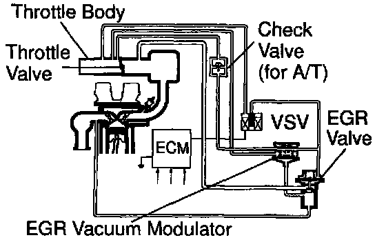 The EGR system recirculates exhaust gas, which is controlled to the proper quantity to suit the driving conditions, into the intake air mixture to slow down combustion, reduce the combustion temperature and reduce NOx emissions. The amount of EGR is regulated by the EGR vacuum modulator according to the engine load.