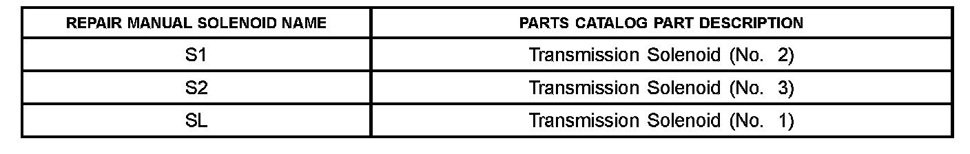 Provided above is a chart listing the Repair Manual name of each solenoid used in the 3-solenoid version of the A340 transmission as well as the part name description provided in the Electronic Parts Catalog.