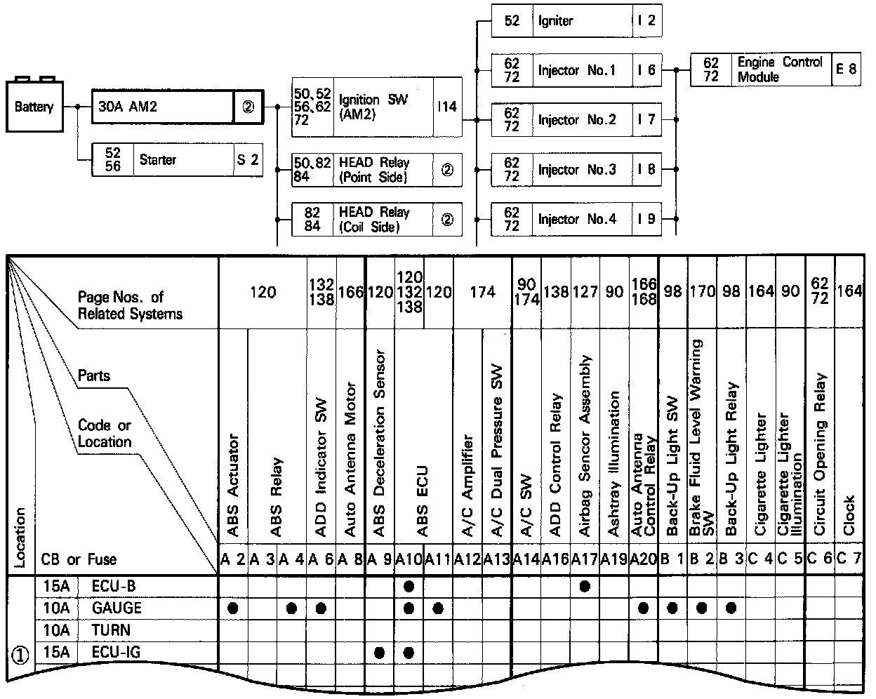 The chart shows the route by which current flows from the battery to each electrical source (Fusible Link, circuit Breaker, Fuse, etc.) and other parts.