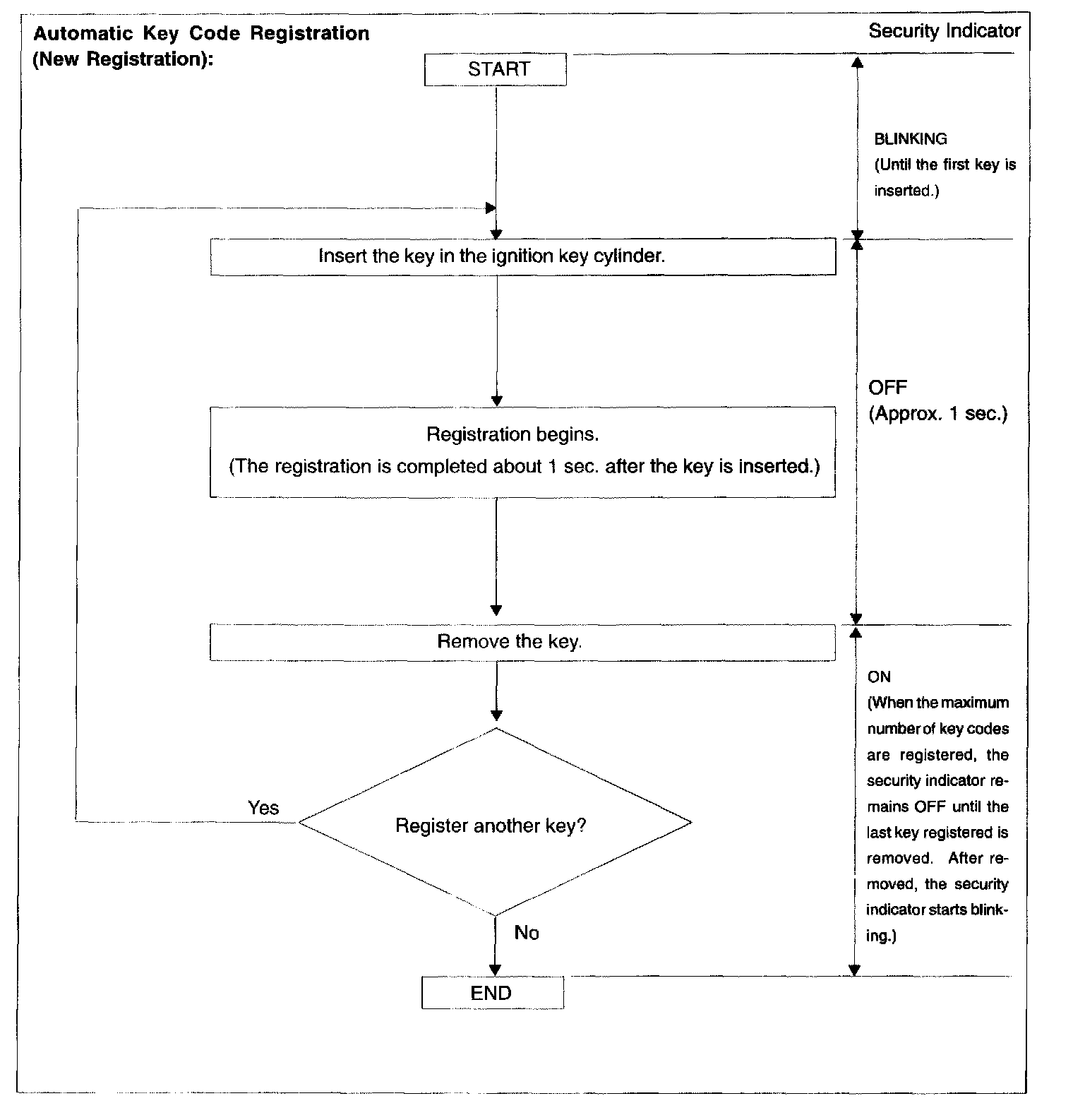 - When no key is inserted in the ignition key cylinder in the automatic key code registration mode, the security indicator remains on.