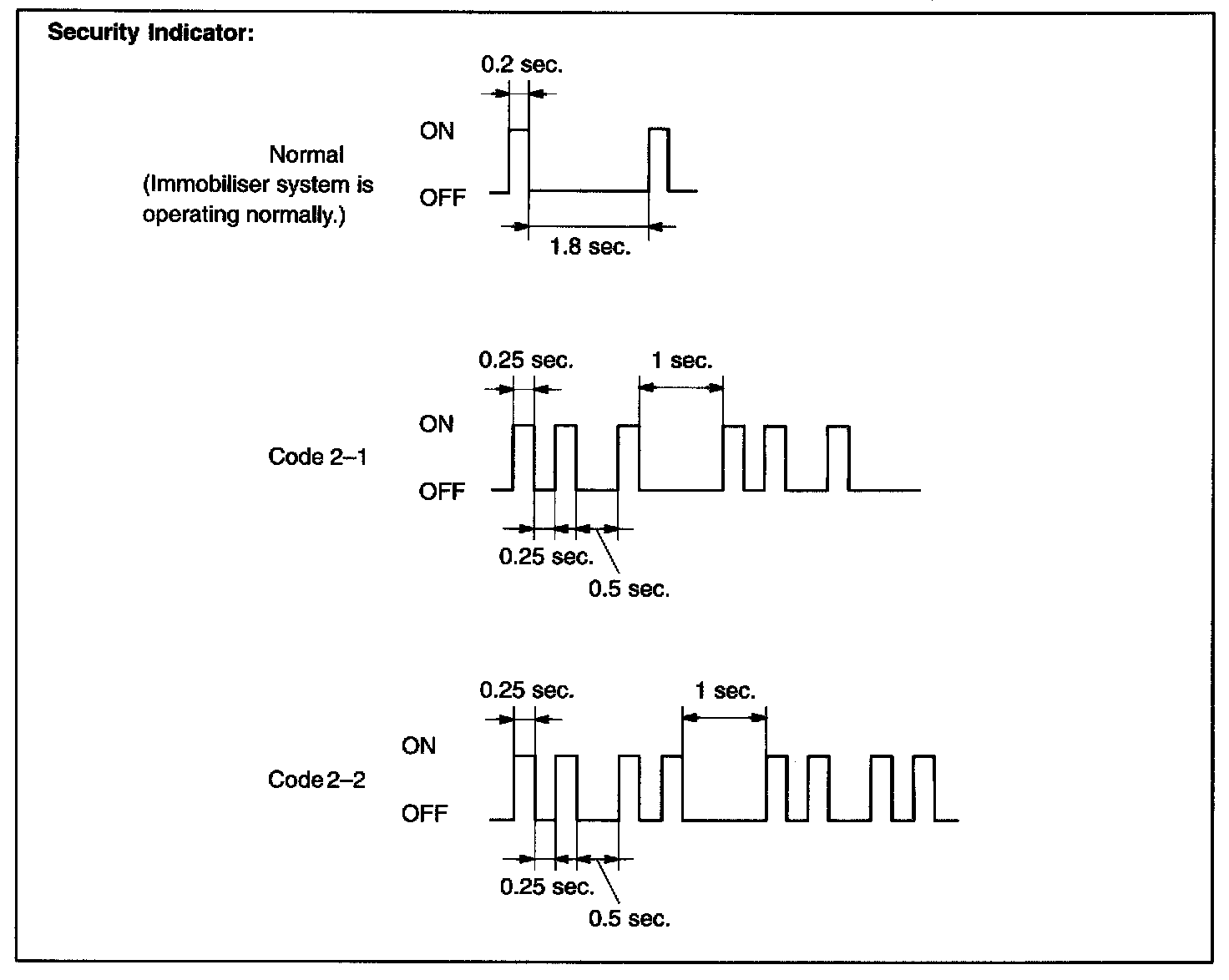 NOTE: If the key code registration has failed in the automatic key code registration mode, code 2-1 will be output from the security indicator. Trying to re-register an already registered key will cause code 2-2 to be output when the key is inserted. The output details are shown.