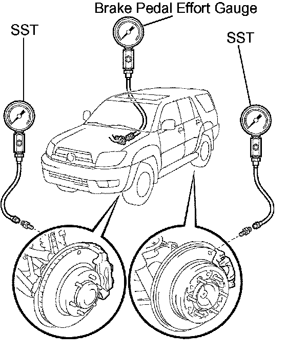 c. Install the LSPV gauge (SST) and brake pedal effort gauge, and bleed air.