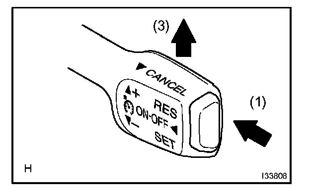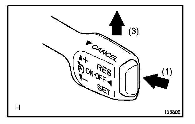 3. Check that the vehicle speed increases while the control switch is pull up to +/RES, and that the vehicle cruises at the set speed when the switch is released.